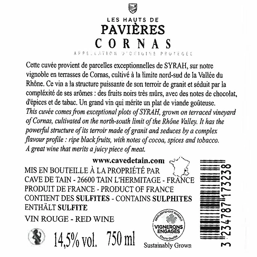 - Cave de Tain Les Hauts de Pavières 2019 est un vin rouge d’exception de l’appellation Cornas AOP, produit en France. Ce vin, d’une qualité supérieure, est parfait pour accompagner vos repas gastronomiques.