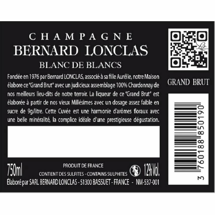 - Le Champagne Bernard Lonclas Brut Blanc de Blancs est un véritable joyau de la région de Champagne, élaboré à partir de raisins Chardonnay soigneusement sélectionnés.