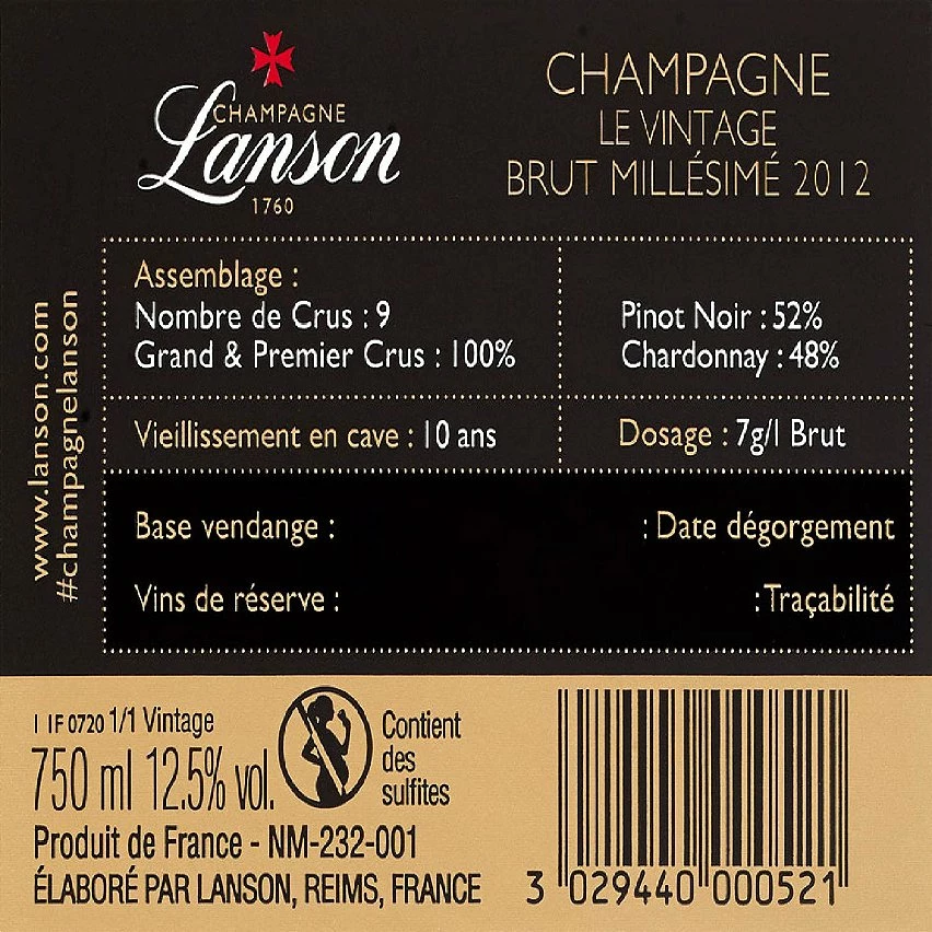 - Le Champagne Lanson Millésimé Brut 2012 est un vin effervescent d’exception, élaboré avec soin par la prestigieuse maison Lanson. Son millésime unique en fait un choix de prestige pour les amateurs de champagne.