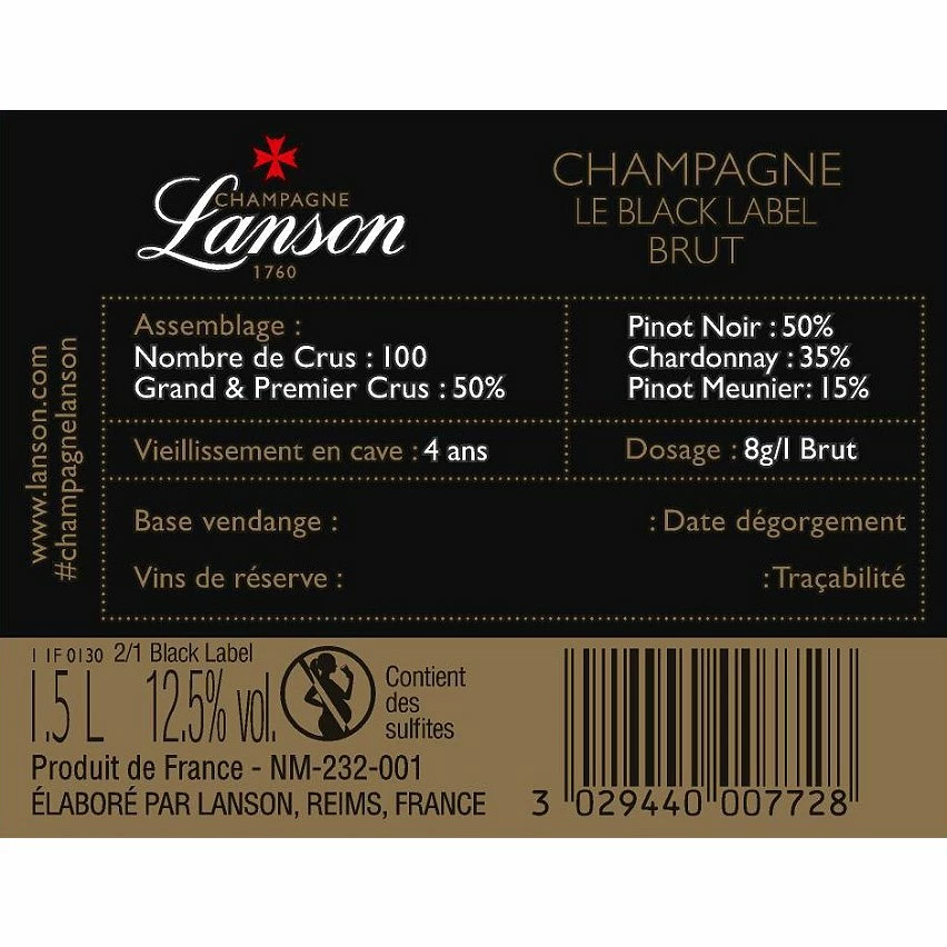 - Le Magnum Champagne Lanson Le Black Label Brut en format 150 cl est idéal pour les grandes occasions. Son goût frais et équilibré en fait un choix privilégié pour célébrer les moments spéciaux.