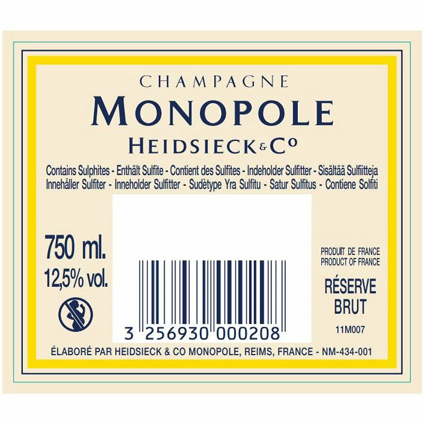 - Avec sa robe dorée et ses fines bulles, le Champagne Heidsieck Monopole Réserve Brut séduit par son raffinement et sa complexité aromatique.
