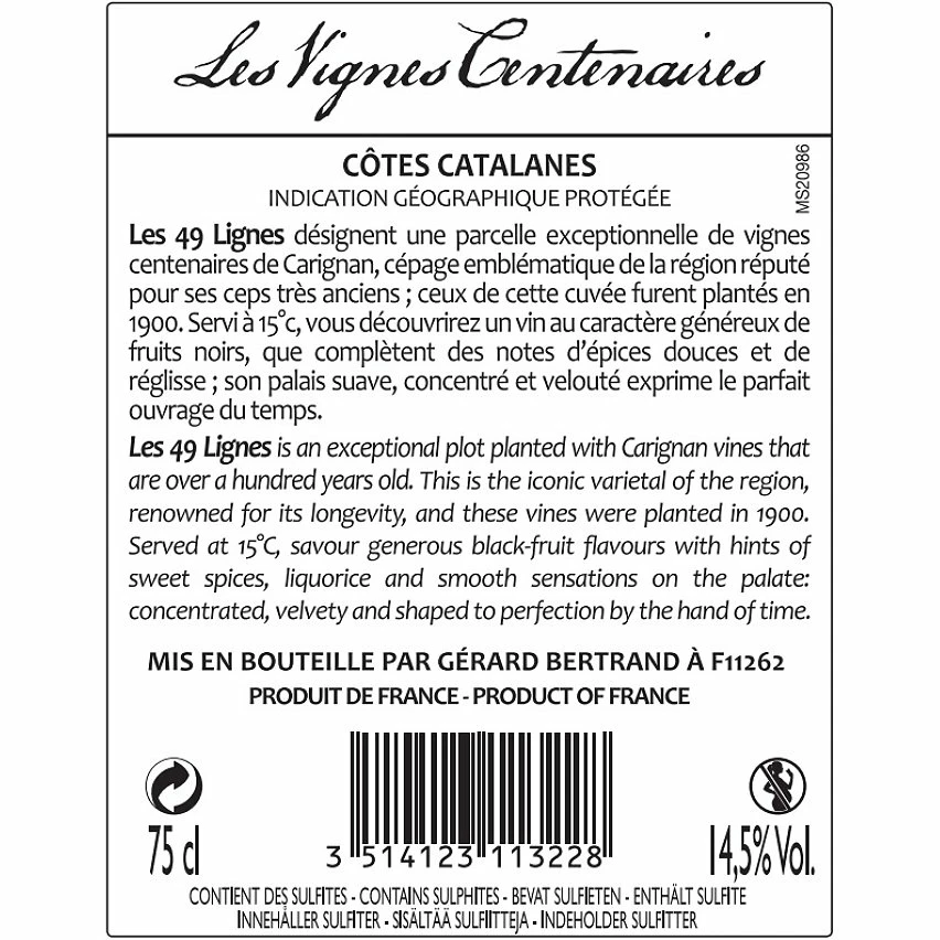 - Dégustez l’authenticité avec Les Vignes Centenaires Les 49 Lignes 2016, un vin rouge exceptionnel de l’appellation Côtes Catalanes IGP. Parfait pour les amateurs de vins riches et complexe.
