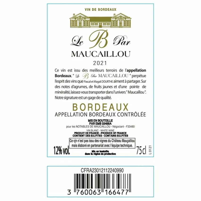 - Dégustez le Vin Blanc Sec Le B Par Maucaillou 2021, un Bordeaux AOP exceptionnel. Idéal pour accompagner vos repas ou pour offrir.