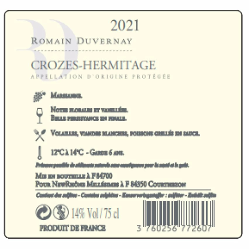 - Dégustez l’excellence du Vin Blanc Sec Romain Duvernay, Crozes-Hermitage AOP 2021. Ce vin blanc français, d’une qualité exceptionnelle, est idéal pour accompagner vos repas ou pour être offert en cadeau.